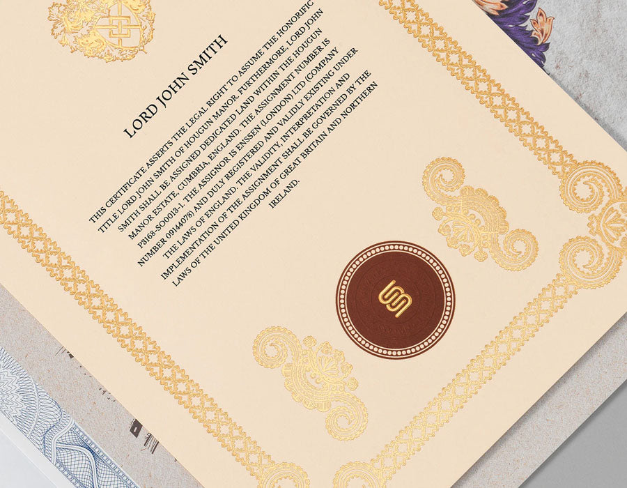 This title pack includes a beautiful personalised title certificate, elegantly embossed with gold foil.